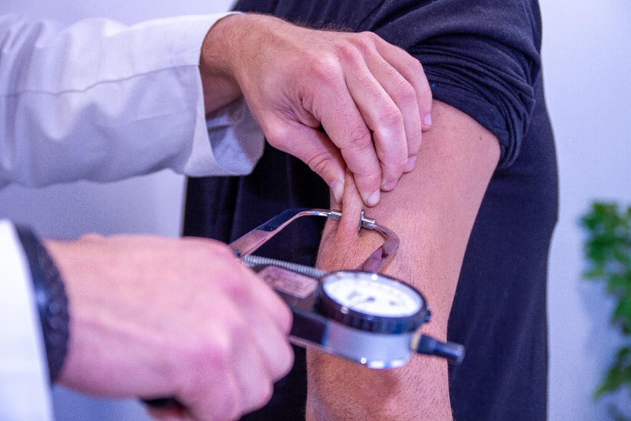 - Cálculo de la composición corporal (% grasa corporal, % masa muscular, % masa ósea, % nivel hídrico) por plicometría, perímetro cintura-cadera, impedancia bioeléctrica.